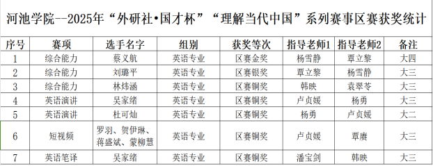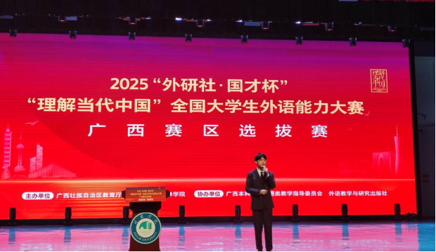 近日,2025年“外研社・国才杯”“理解当代中国”系列赛事广西赛区比赛顺利收官。河池学院外国语学院组织我校学子积极参与,凭借扎实的外语专业功底、出色的综合应用能力及良好的精神风貌,在多个赛项中斩获佳绩,充分展现了学校外语学科教学成果与人才培养质量。