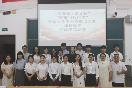 10月12日,2025年“外研社·国才杯”“理解当代中国”全国大学生外语能力大赛河池学院校赛成功举办并圆满落下帷幕。本次大赛不仅是我校检验“三进”教学成果、锻炼学生英语综合能力的重要平台,更是引导青年学子用外语讲好中国故事、传播时代声音的生动实践。