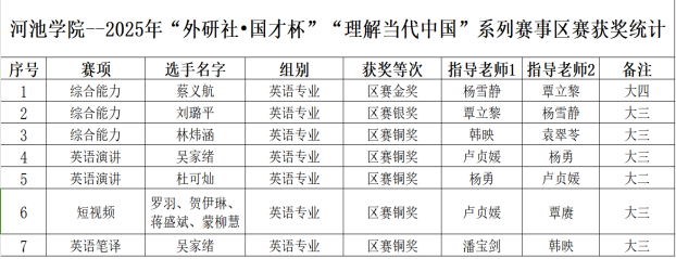 11月1日,2025年“外研社・国才杯”“理解当代中国”系列赛事广西赛区比赛顺利收官。河池学院外国语学院组织我校学子积极参与,凭借扎实的外语专业功底、出色的综合应用能力及良好的精神风貌,在多个赛项中斩获佳绩,充分展现了学校外语学科教学成果与人才培养质量。