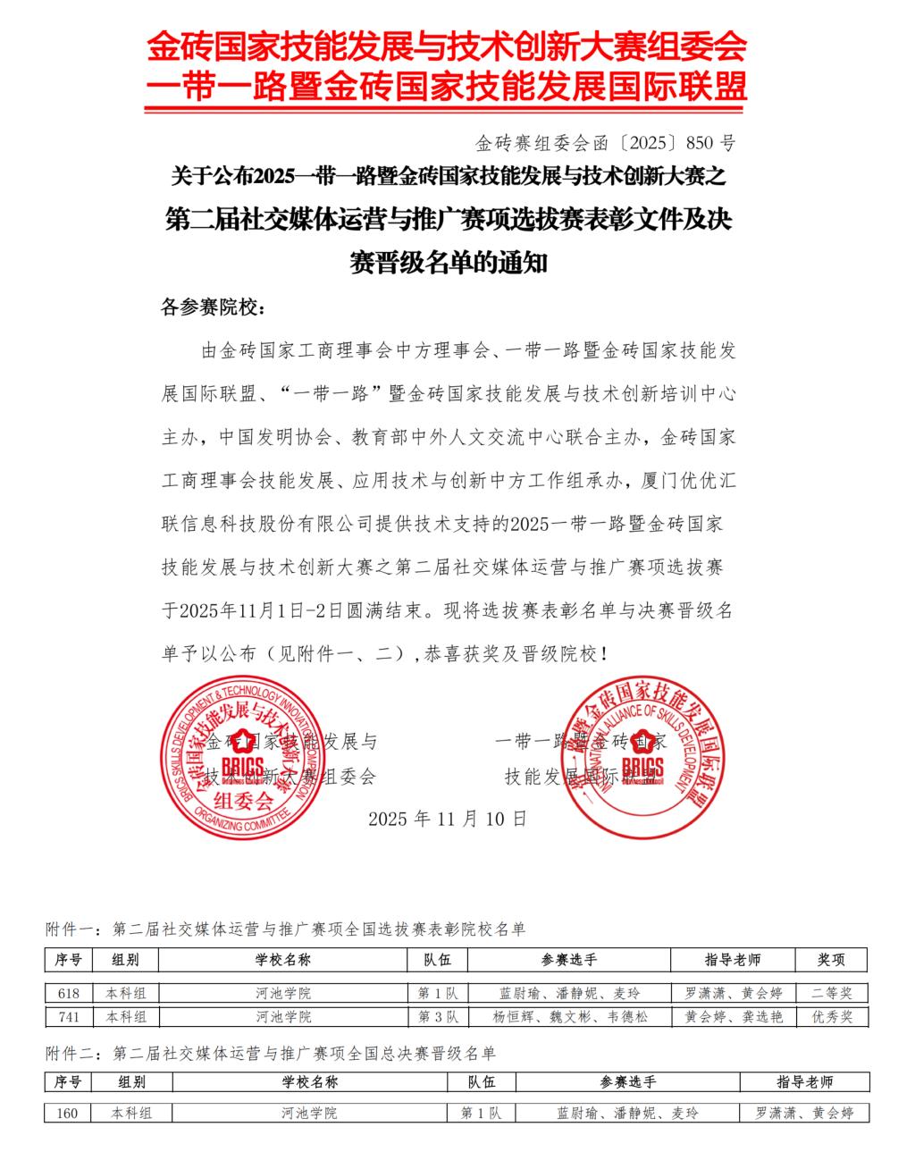 近日,2025“一带一路”暨金砖国家技能发展与技术创新大赛第二届社交媒体运营与推广赛项全国选拔赛(本科组)表彰文件及决赛晋级名单正式公布,我校外国语学院2023级商务英语专业蓝尉瑜、潘静妮、麦玲团队斩获二等奖并晋级全国总决赛,2024级商务英语专业杨恒辉、魏文彬、韦德松团队荣获优秀奖。