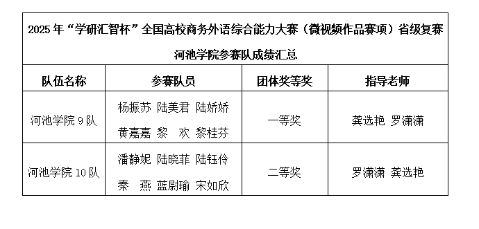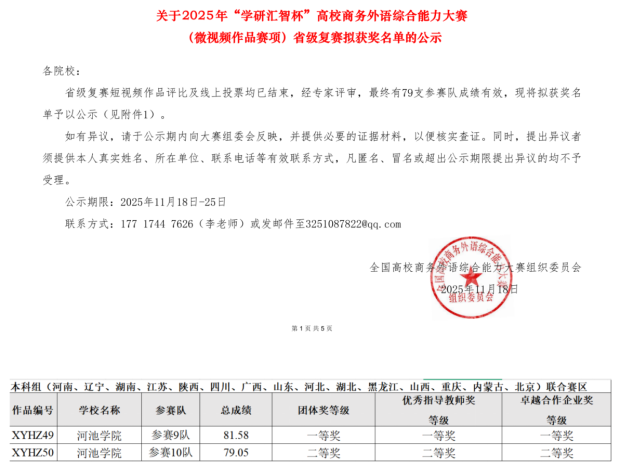 近日,2025年“学研汇智杯”全国高校商务外语综合能力大赛(微视频作品赛项)省级复赛圆满落幕。外国语学院2023级商务英语专业12名学生组成2支队伍参赛,分别荣获团体一等奖和团体二等奖。